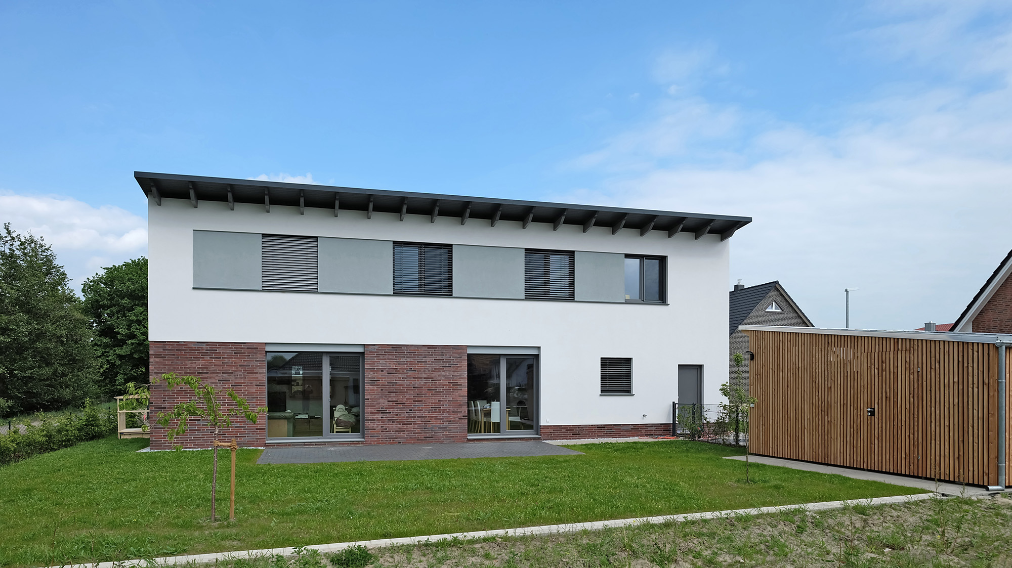 Fassade mit Stegträger auf Kalksandstein Rohbau mit Zellulose und Holzfaserputzträgerplatte mit mineralischem Putz Teilflächen verklinkert Büro Dipl.-Ing. Stefan Busse (2017)