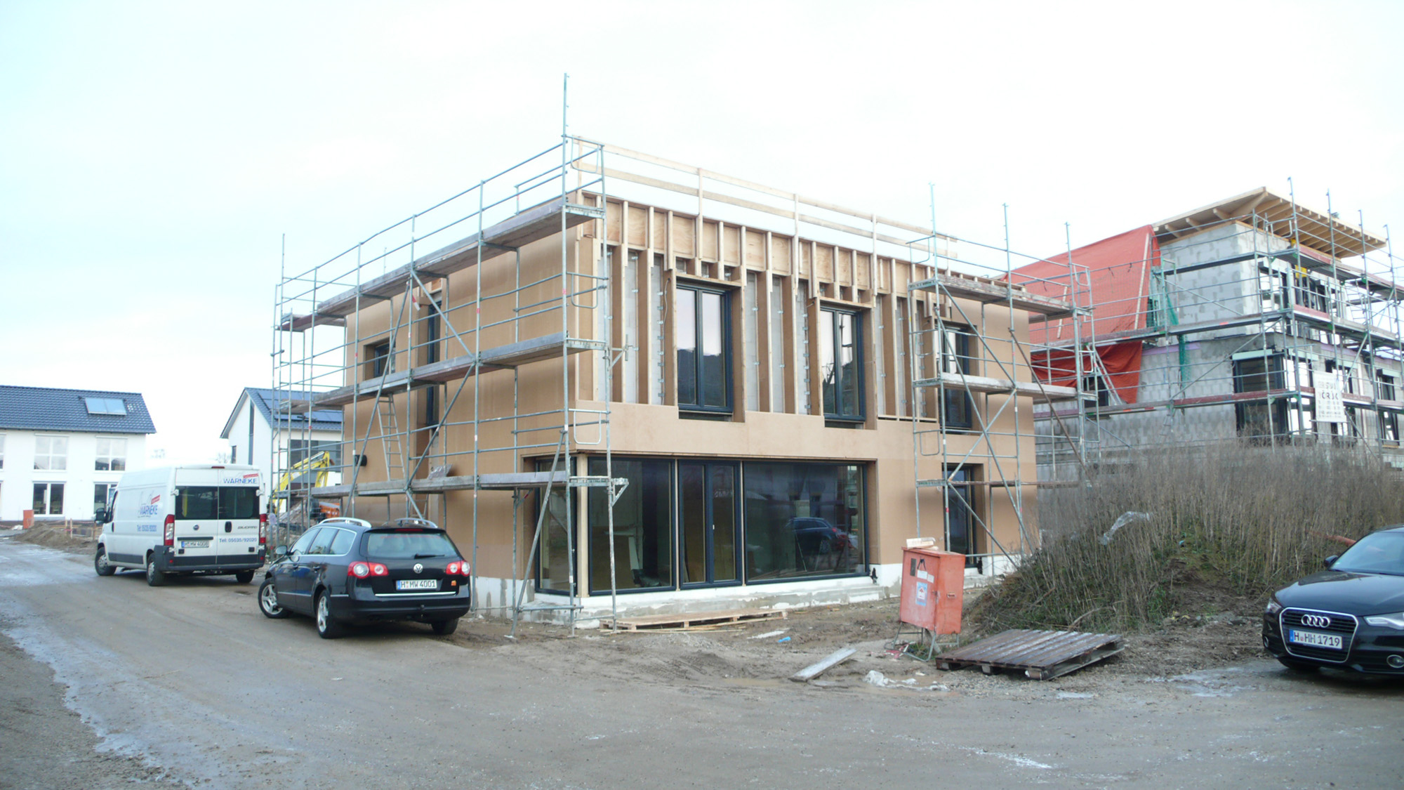 Fassade mit Stegträger auf Kalksandstein Rohbau mit Zellulose und Holzfaserputzträgerplatte mit mineralischem Putz Büro Dipl.-Ing. Holger Meyer (2015)